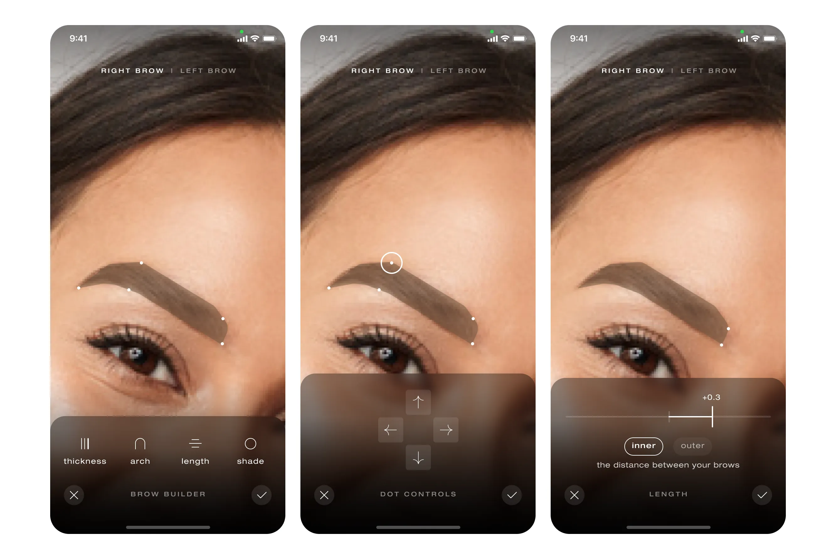 Replaced a tiny length slider with draggable anchor points and arrow nudges (indirect manipulation). Users tap, nudge, and see millimetre‑level changes without covering the brow with a finger.