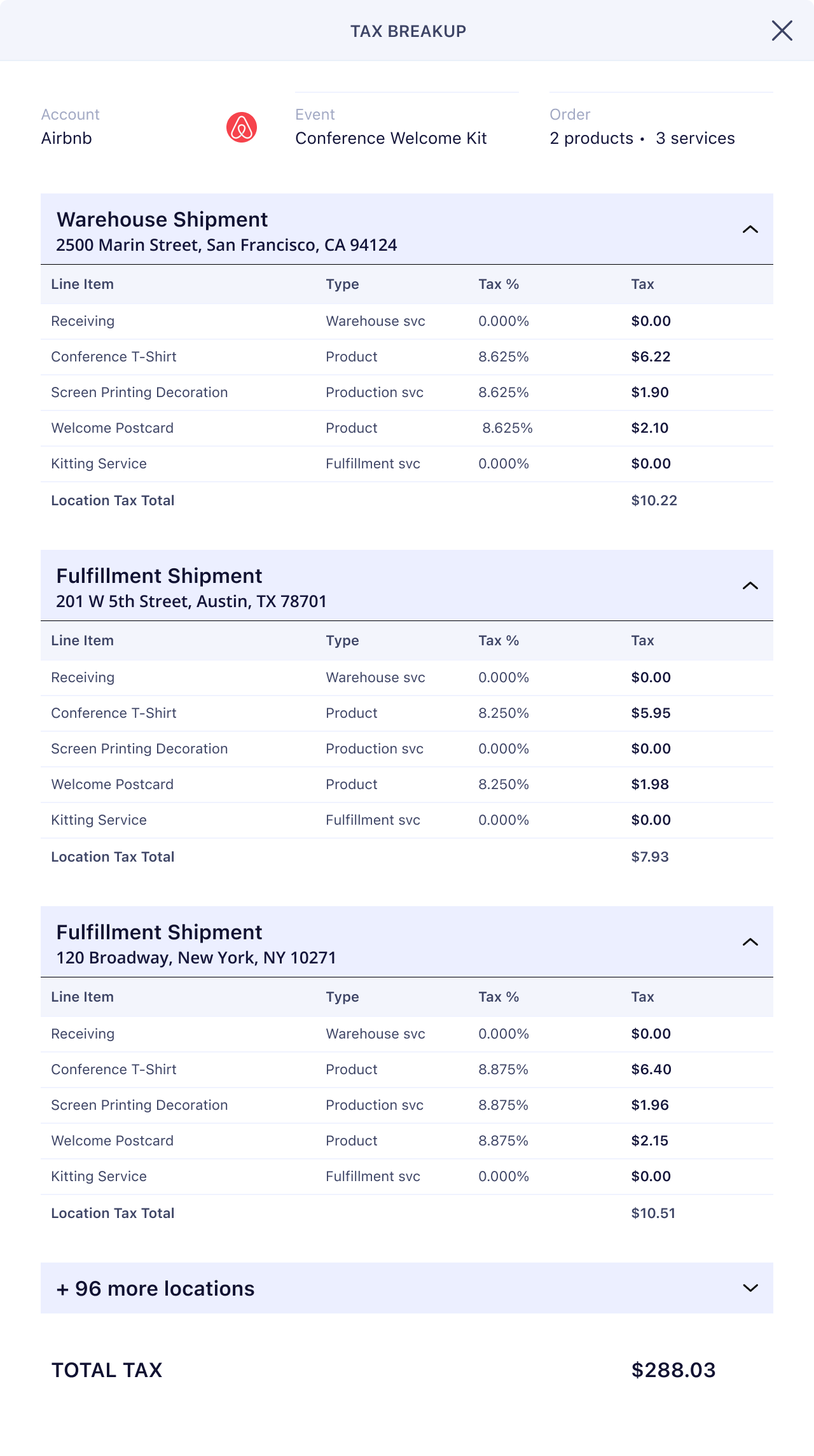 A shirt shipped directly to a customer in one state is taxed one way. The same shirt stored in a warehouse, kitted with other items, and shipped later may be taxed differently. Add a setup fee. Add embroidery. Add split shipping.
